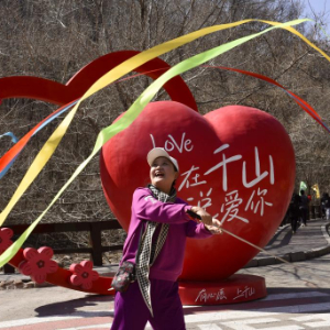3月21日,一名游客在千山景区舞动彩带拍照留念。