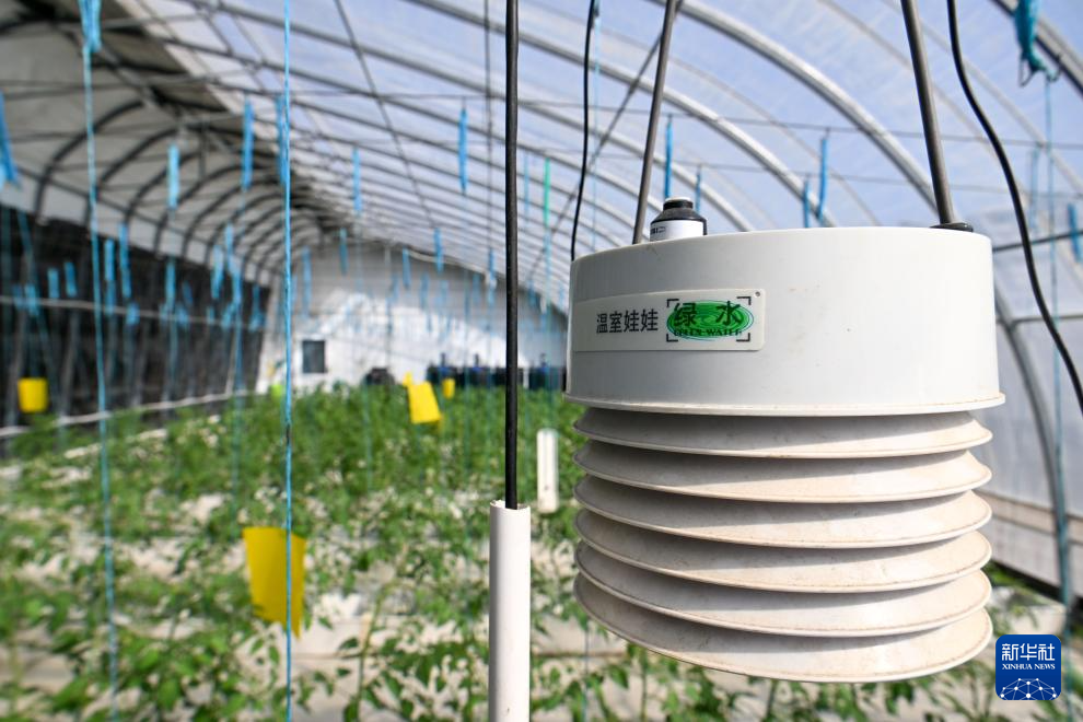 这是3月20日在农芯科技(天津)有限责任公司智慧农业园区智能温室内拍摄的用于监测环境数值的捕捉器。