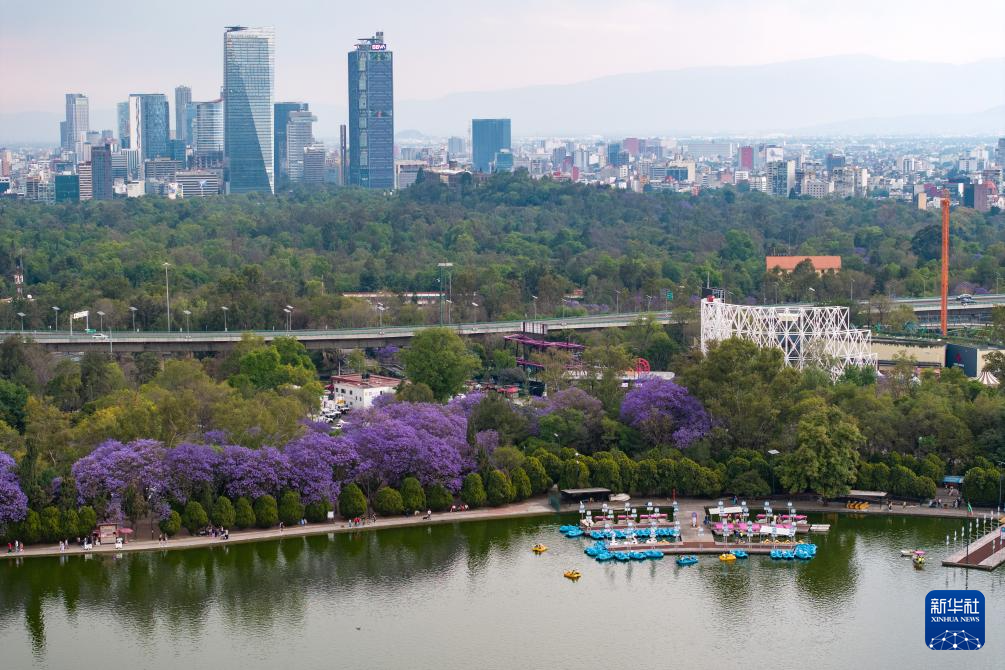 这是3月23日在墨西哥首都墨西哥城查普特佩克公园拍摄的盛开的蓝花楹(无人机照片)。