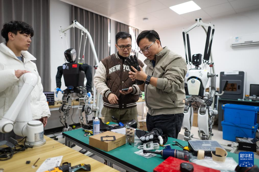 3月19日,在武汉大学机器人学习算法与软操作实验室内,研发团队在对“天问”人形机器人进行研发调试。