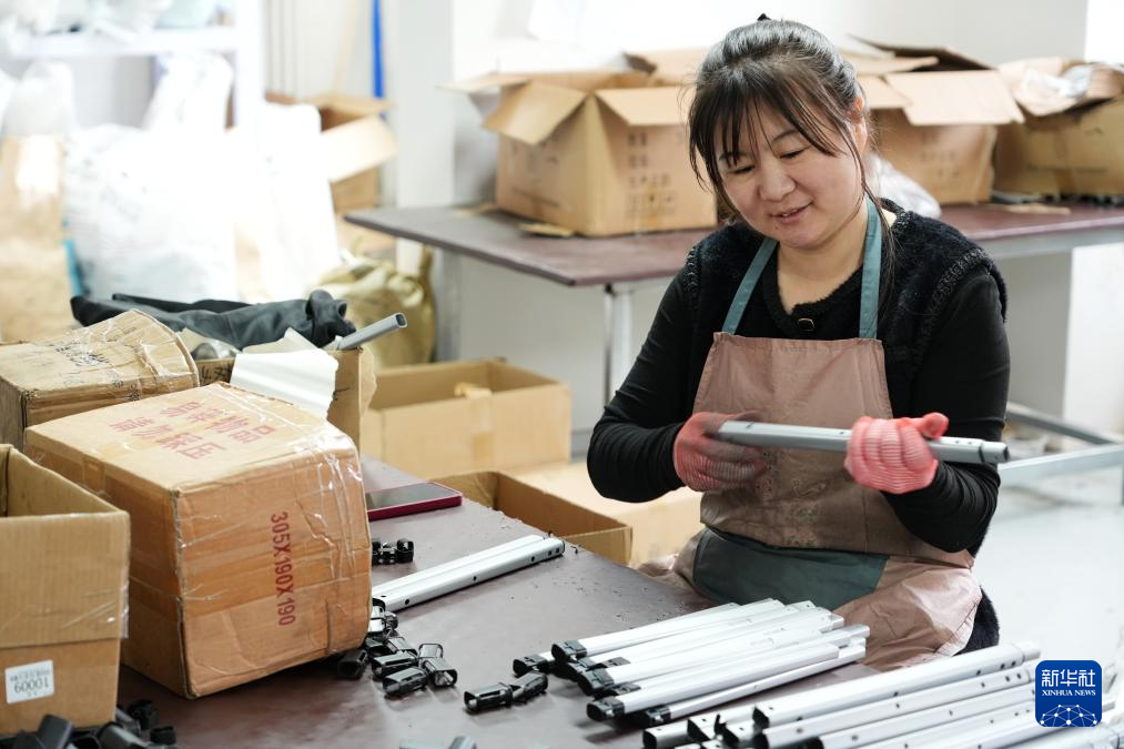 3月27日,一名回迁居民在“雄业创工坊”箱包配件工坊里组装拉杆。