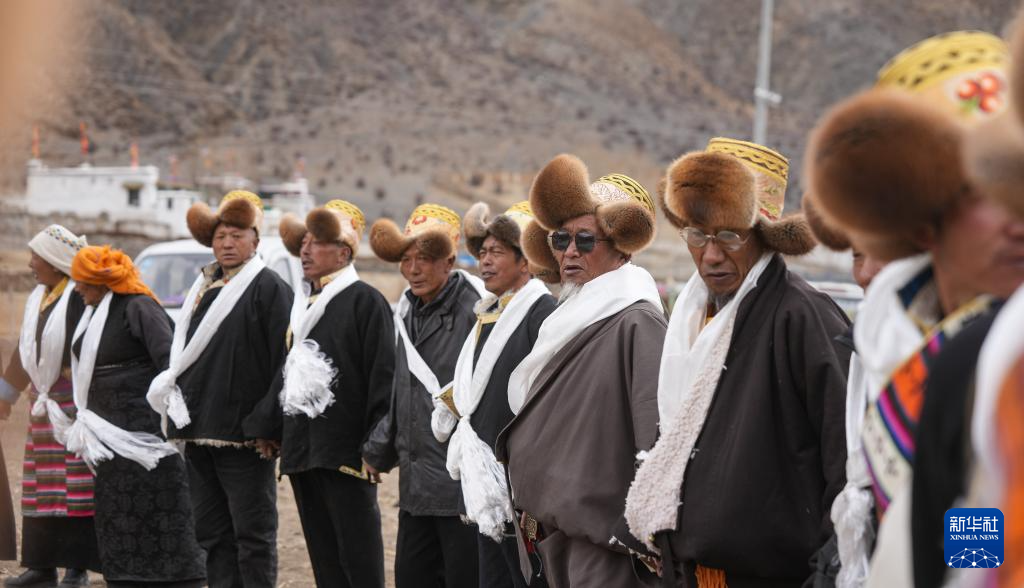旺庆老人(左七)在春耕大典上唱颂词(3月16日摄)。