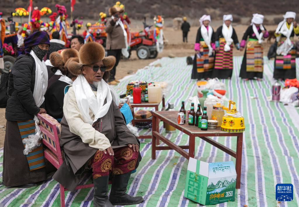 旺庆老人(前)在春耕大典上看着年轻人跳舞(3月16日摄)。