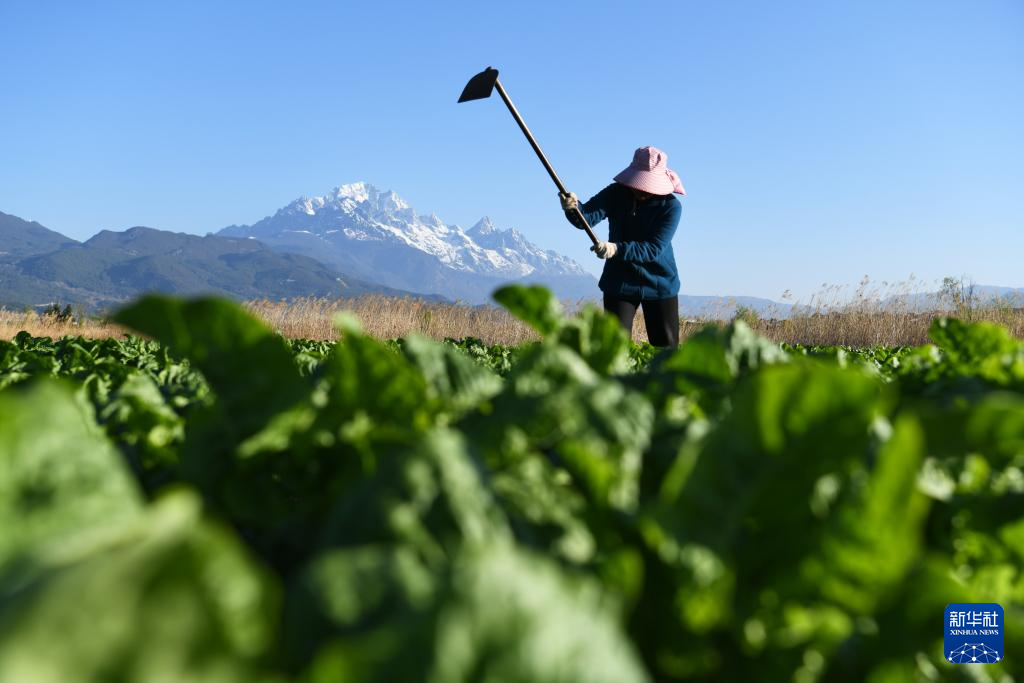 春暖时节,云南省丽江市玉龙县春耕备耕工作正在进行,农民在雪山脚下的田野中忙碌。