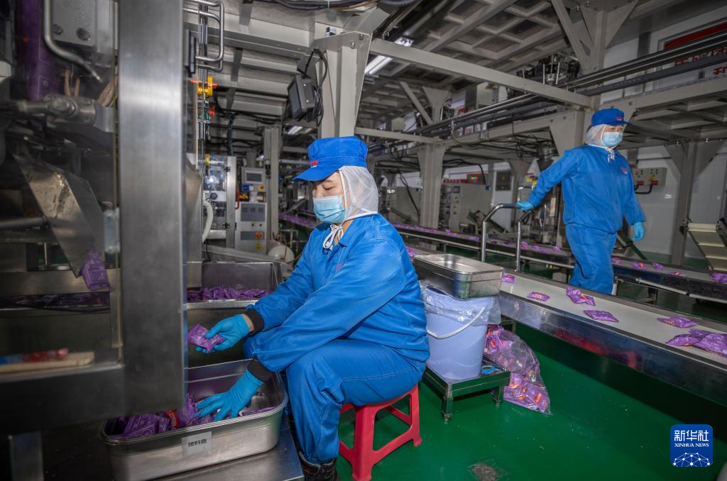 3月27日,在位于宁夏贺兰工业园区的宁夏厚生记食品有限公司智能化休闲食品加工车间内,工作人员分拣产品。