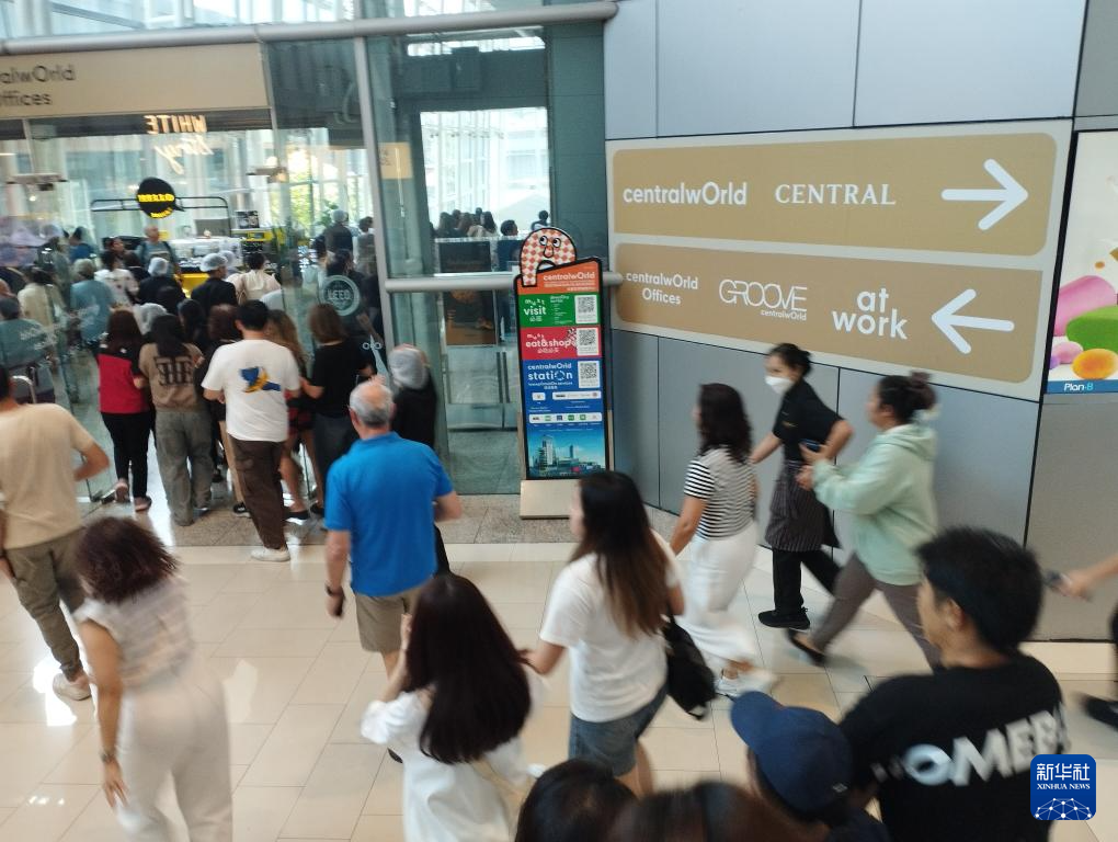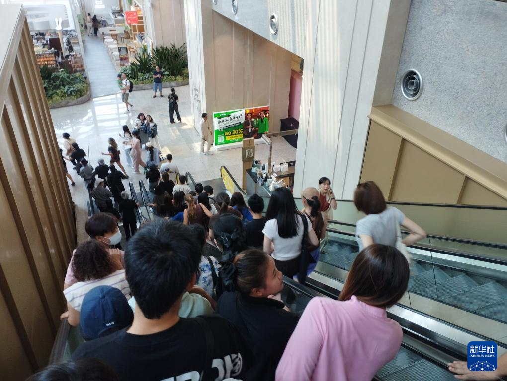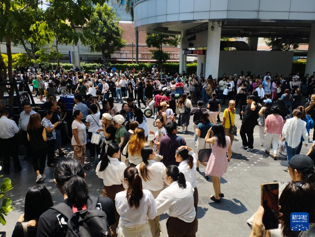 3月28日,在泰国曼谷,人们在地震发生后走出建筑避险。