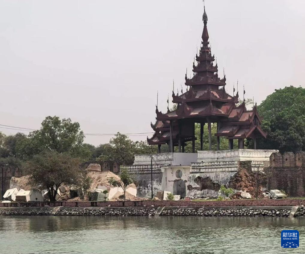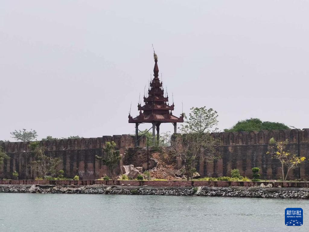 这是3月28日在缅甸曼德勒省拍摄的地震后受损的曼德勒皇宫围墙。