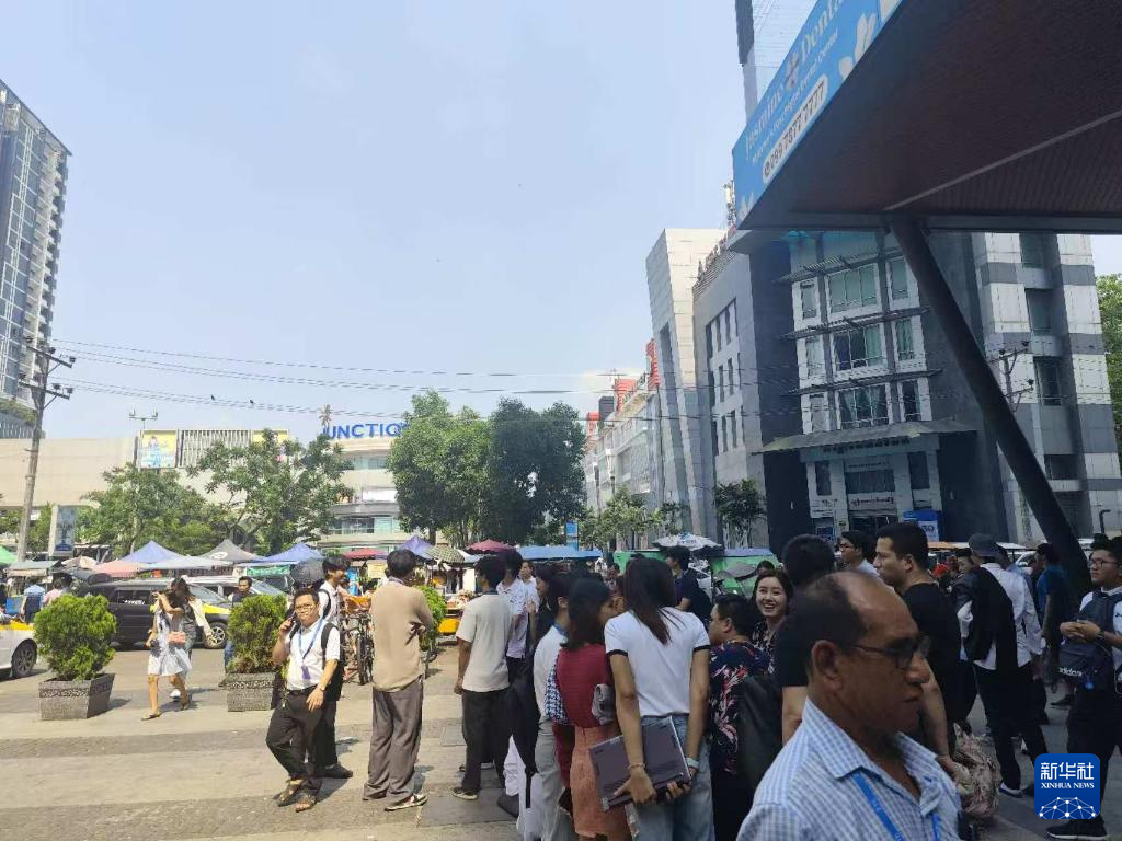 3月28日,在缅甸仰光,人们在地震发生后到街道上避险(手机照片)。