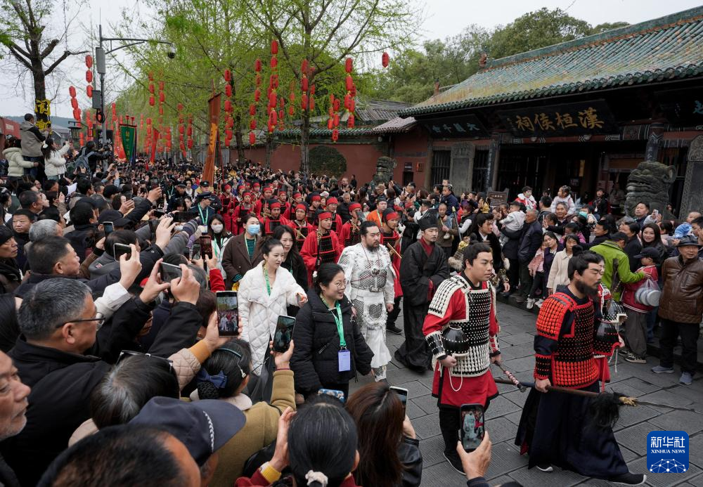 3月29日,婚礼方阵的巡游队伍通过阆中古城汉桓侯祠。