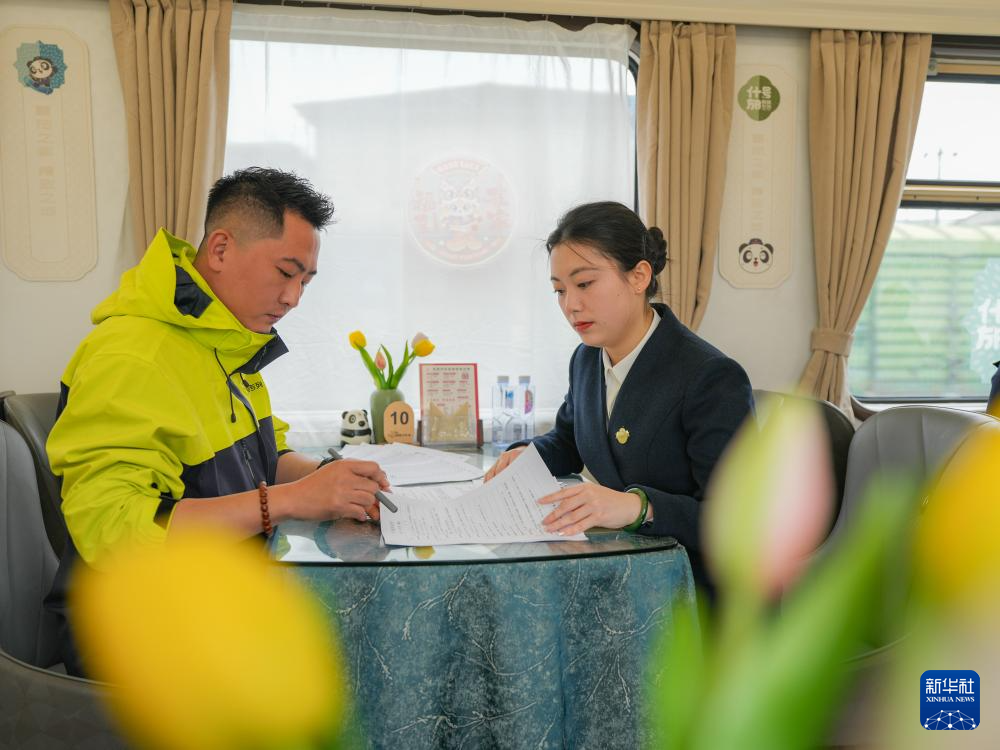 3月28日,在Y471次“熊猫专列·什邡号”列车上,“熊猫管家”张富铭在车厢内收集旅客的意见建议。
