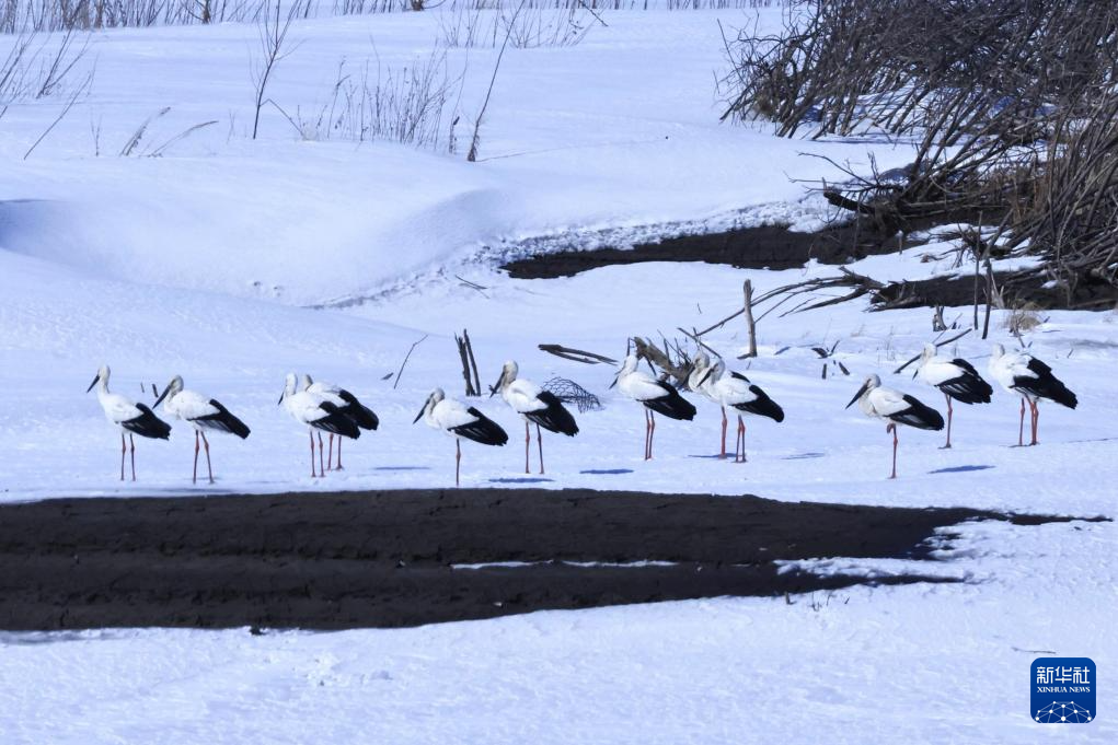 3月29日,在黑龙江省抚远市沿江公园湿地,一群东方白鹳在冰面上休息。