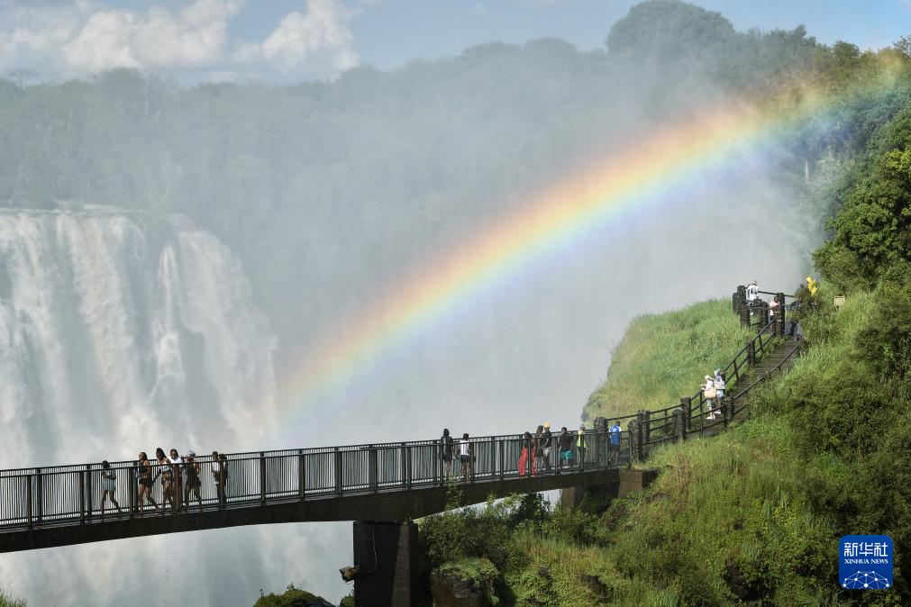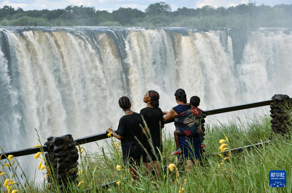 3月29日,游客在赞比亚一侧观赏维多利亚瀑布景色。