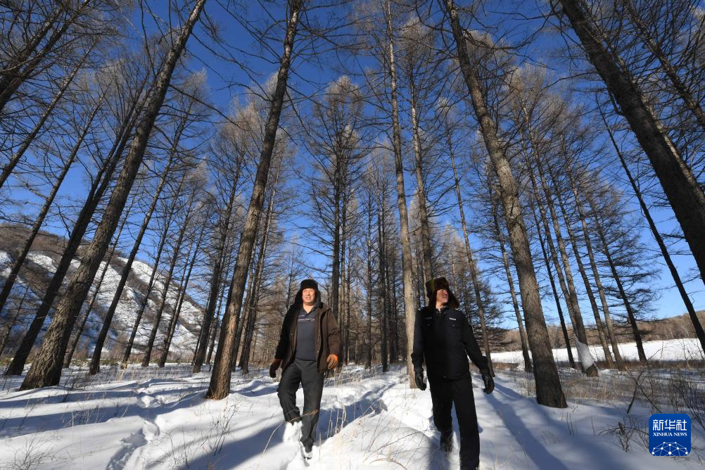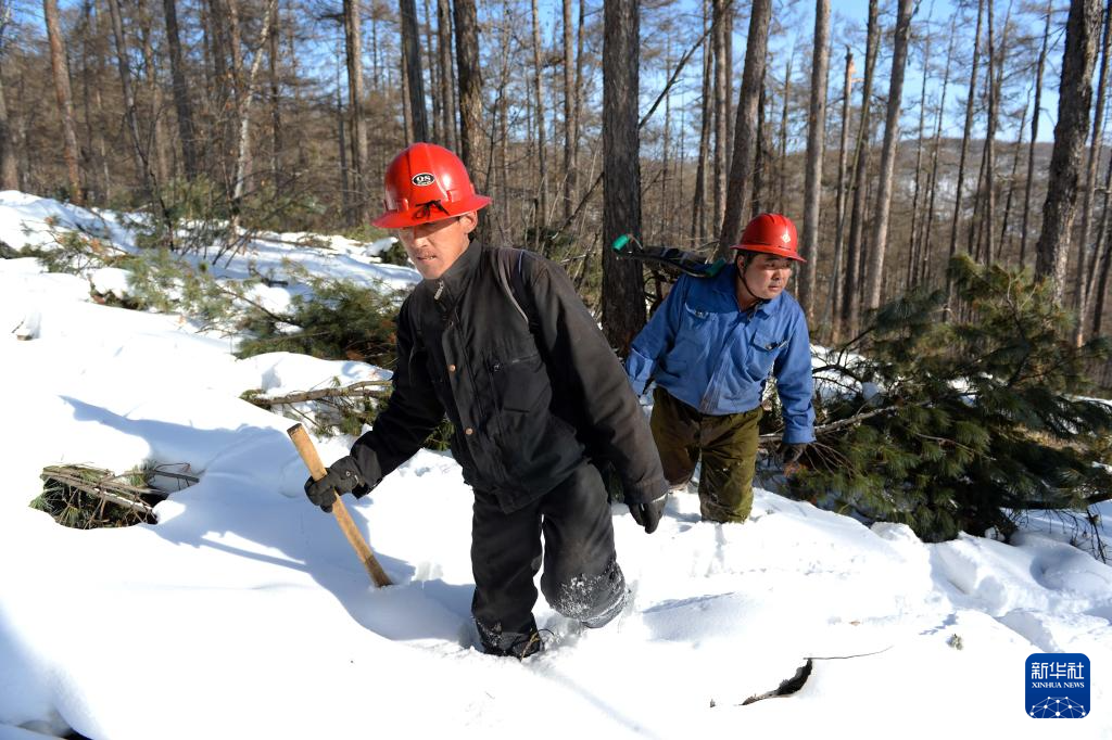 2018年1月10日,张明裕(左)和陈庆林在内蒙古自治区阿尔山市光顶山林场进行日常巡护工作。两人干了10多年的伐木工作,停伐之后,他们成了护林员。