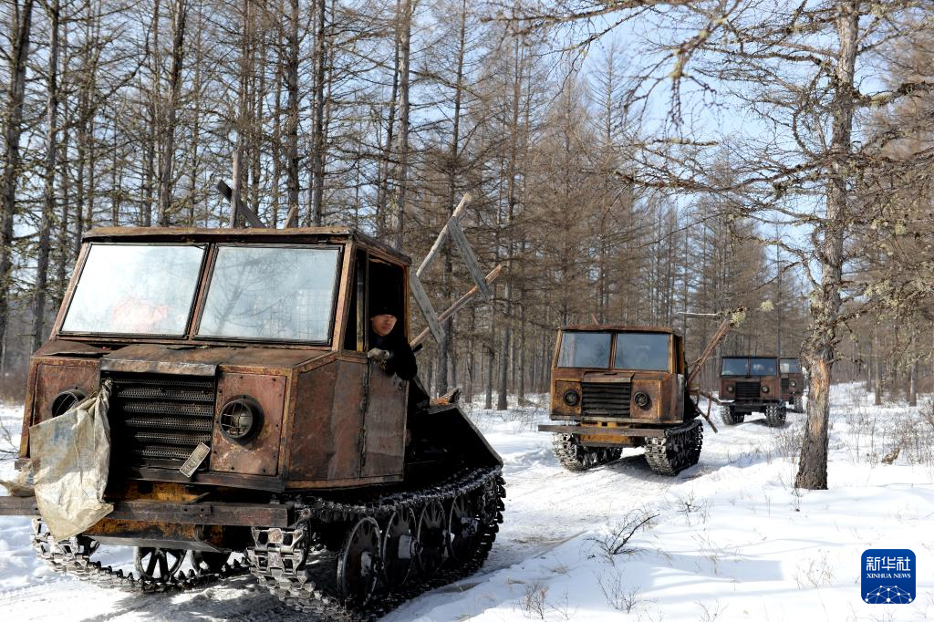 内蒙古根河林业局萨吉气林场工人驾驶履带式集材车转场作业(2015年3月12日摄)。