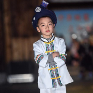 3月31日,在三江侗族自治县鼓楼广场,少儿在T台上展示侗族童装。