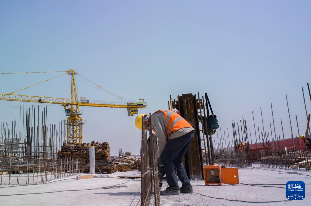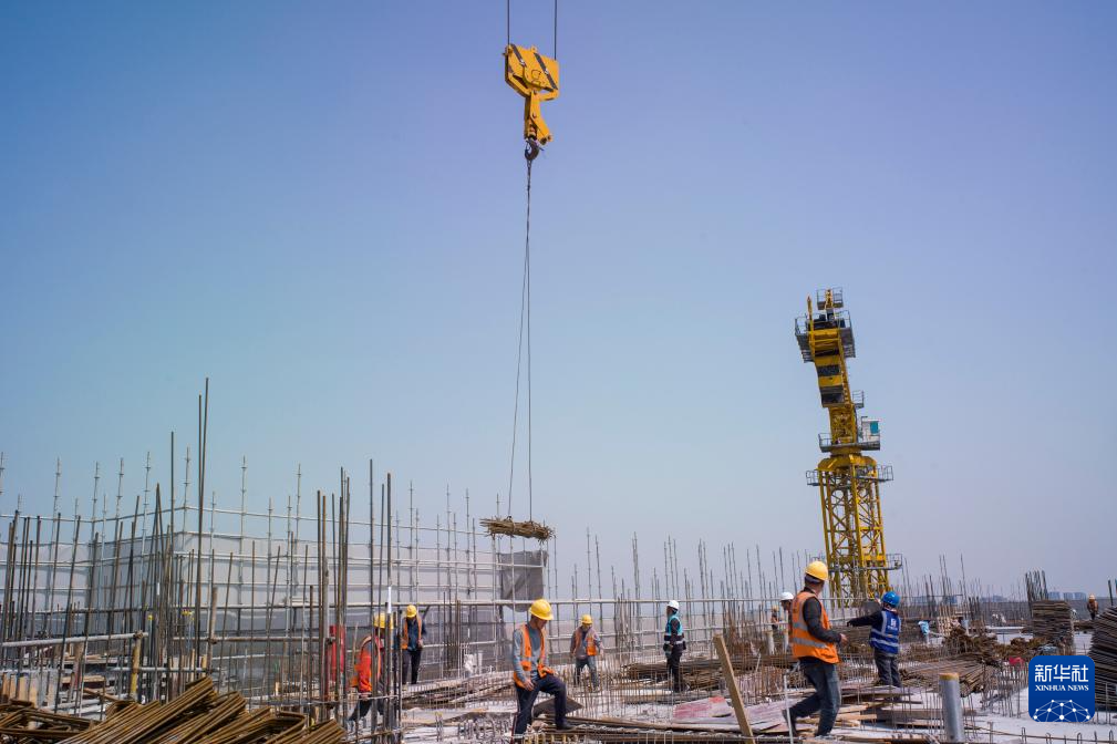 4月1日,工人在复旦大学附属中山医院青浦新城院区一期工程建设项目主楼楼顶进行钢筋支架底座施工。