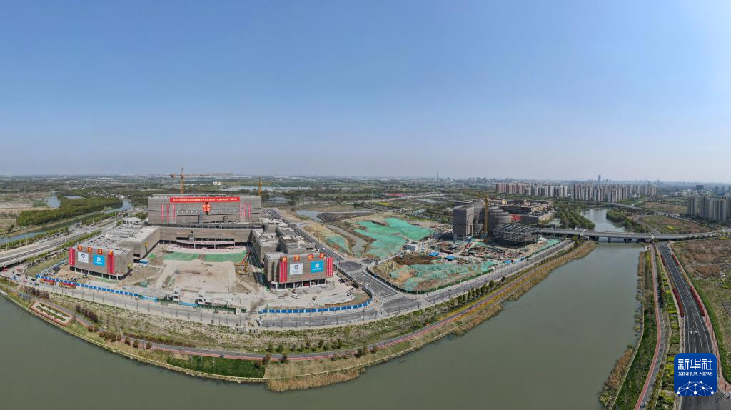 空中俯瞰复旦大学附属中山医院青浦新城院区一期工程建设项目施工现场(4月1日摄,无人机全景照片)。