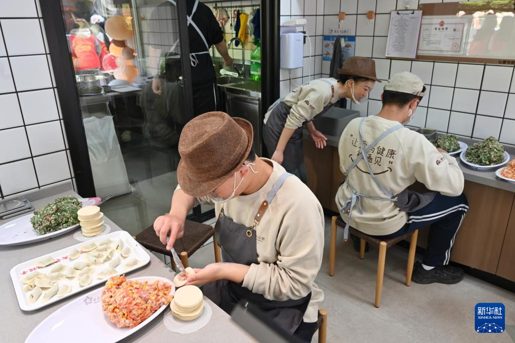 4月1日,“星青年”员工在“星点心愿”——支持孤独症青年工作公益店内包饺子。