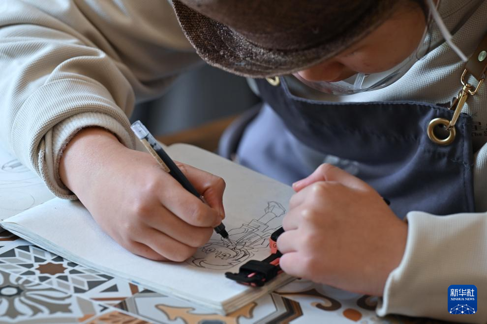 4月1日,在“星点心愿”——支持孤独症青年工作公益店内,一名“星青年”员工在工作间隙作画。