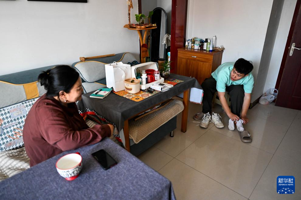 3月30日,在位于呼和浩特市新城区的家中,胡日(右)在母亲乌尼尔其其格引导下穿鞋袜。