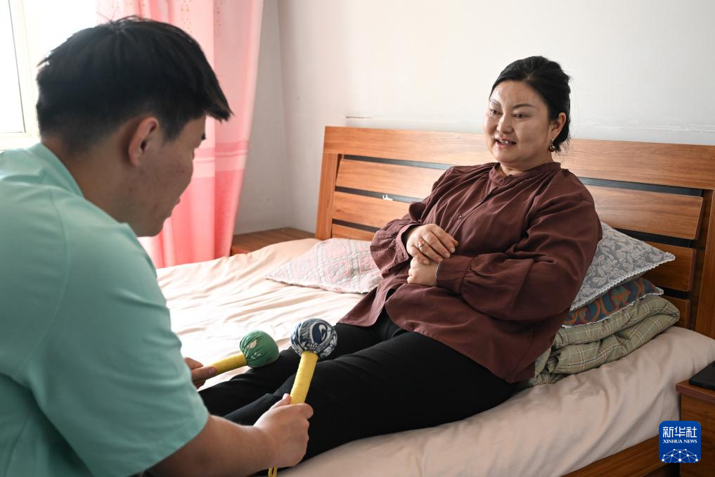 3月30日,在位于呼和浩特市新城区的家中,胡日(左)给母亲乌尼尔其其格敲腿。