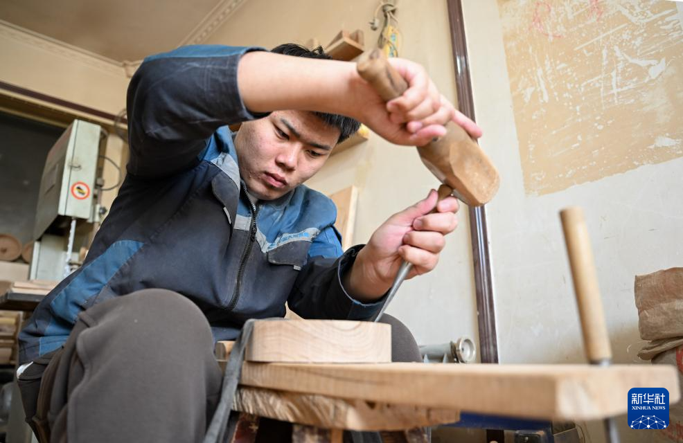 3月31日,在位于呼和浩特市赛罕区的一家木雕工作室,胡日(右)在父亲苏龙嘎的指导下制作木盘。