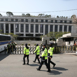 4月3日,在韩国首尔,警察在韩国宪法法院执勤。