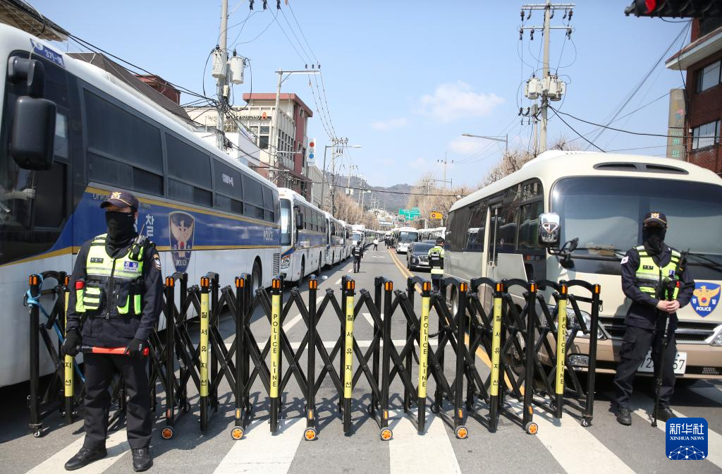 4月3日,在韩国首尔,警察在韩国宪法法院附近进行交通管制。