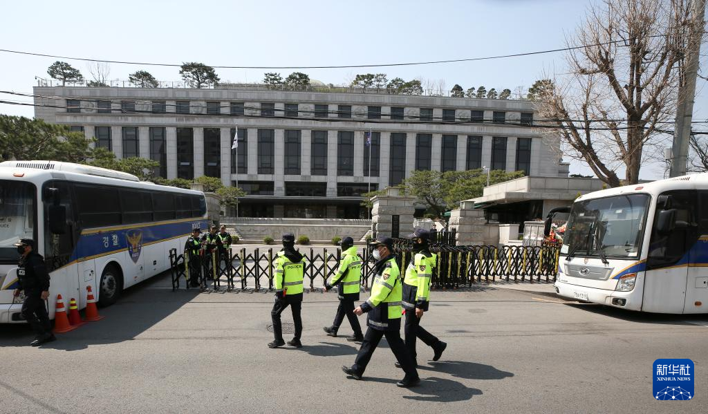 4月3日,在韩国首尔,警察在韩国宪法法院前执勤。