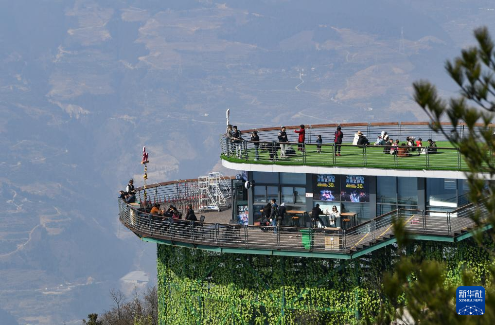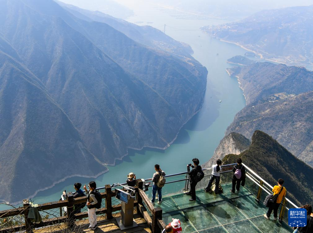 游客在重庆奉节三峡之巅风景区游览(2024年3月11日摄)。