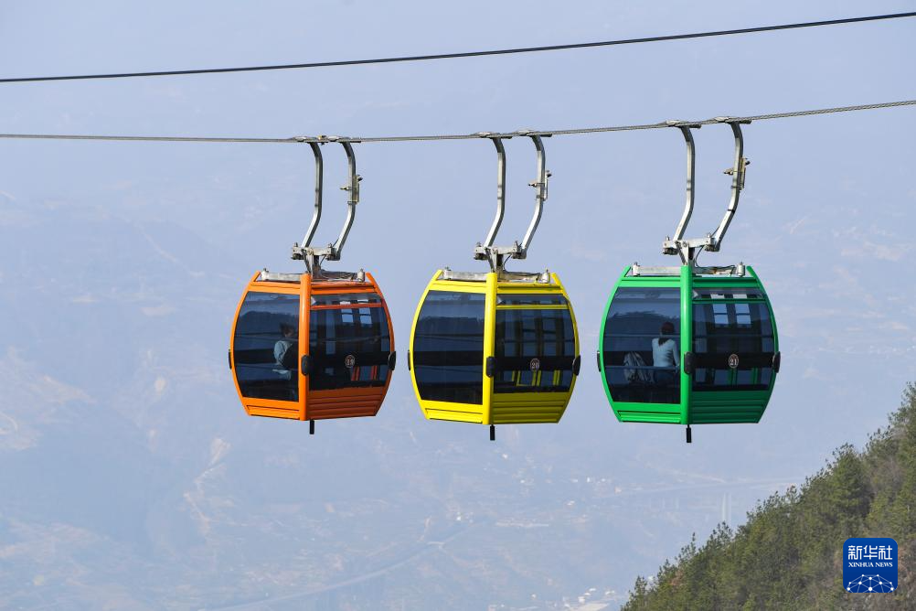 游客乘坐观光缆车在重庆奉节三峡之巅风景区游览(2024年3月11日摄)。