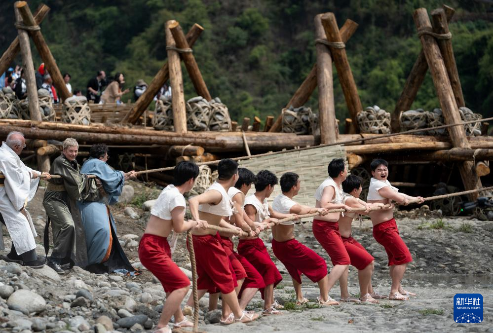4月4日,在2025都江堰放水节上,外国嘉宾与堰工一起拉绑在杩槎上的绳索。