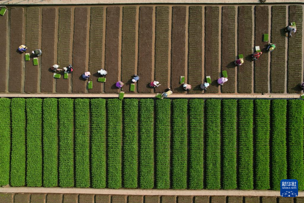 4月4日,农民在云南省玉溪市通海县秀山街道的蔬菜种植基地种蔬菜(无人机照片)。