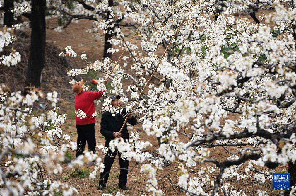 4月4日,果农在山东省滕州市柴胡店镇一梨园为果树人工授粉。