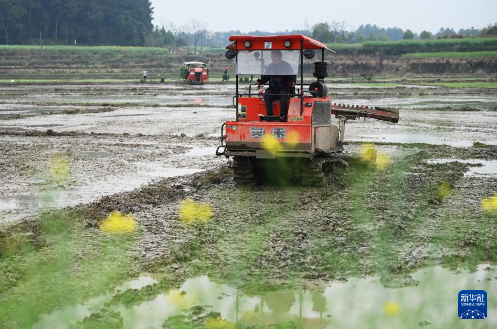 4月4日,村民在湖南省邵阳市洞口县高沙镇驾驶农机翻耕农田。