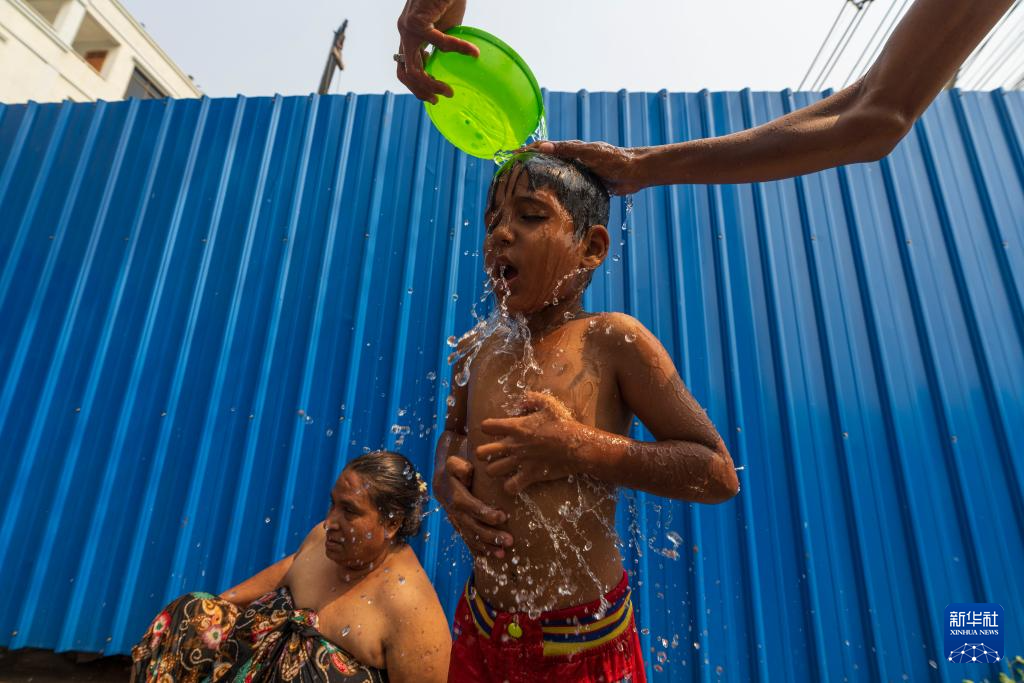 4月4日,在缅甸曼德勒皇宫附近的一处安置点,一名儿童冲凉。