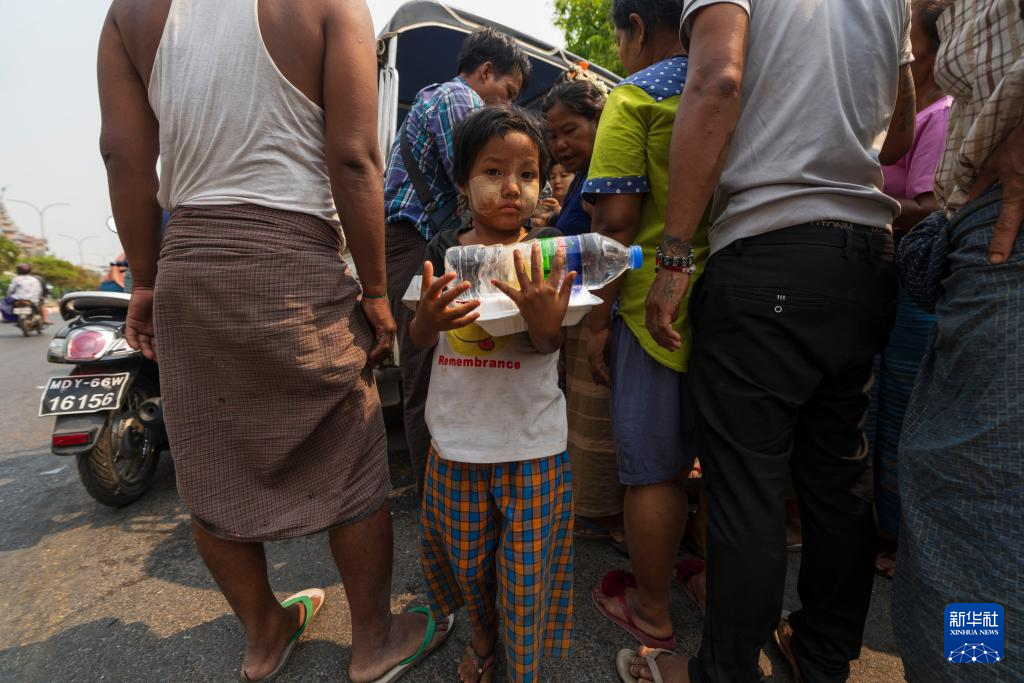 4月4日,在缅甸曼德勒皇宫附近的一处安置点,一名儿童领取食物和饮用水。