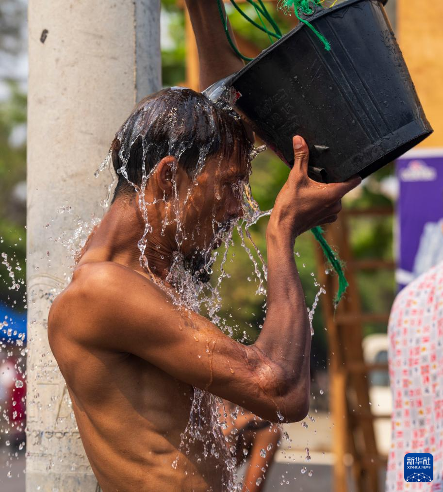 4月4日,在缅甸曼德勒皇宫附近的一处安置点,一名男子冲凉。