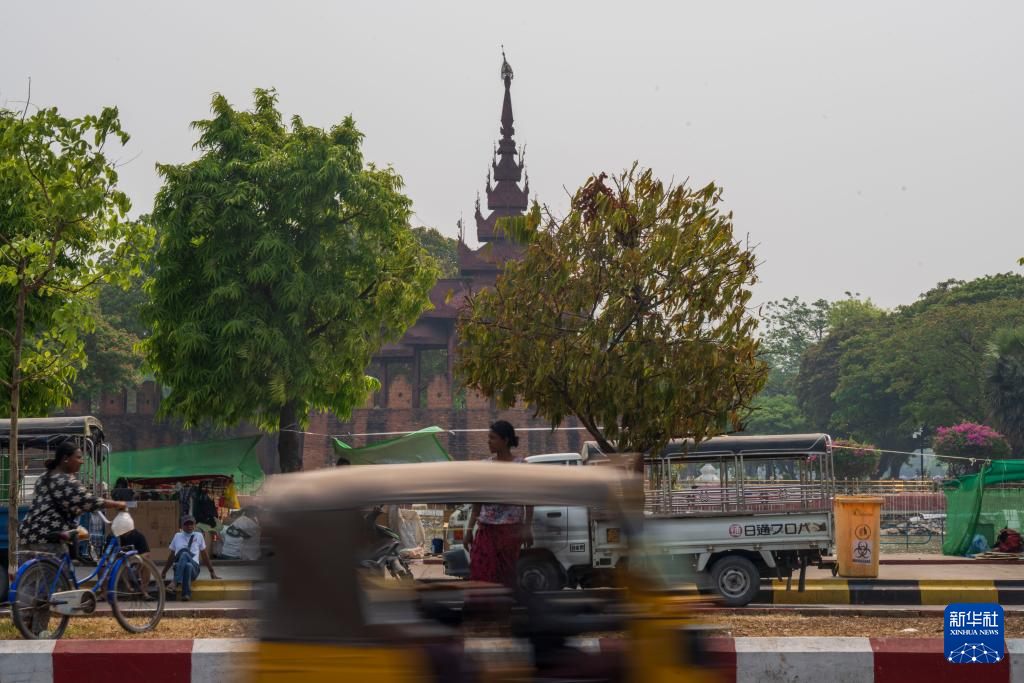 4月4日,在缅甸曼德勒皇宫附近的一处安置点,一名女子穿行马路。