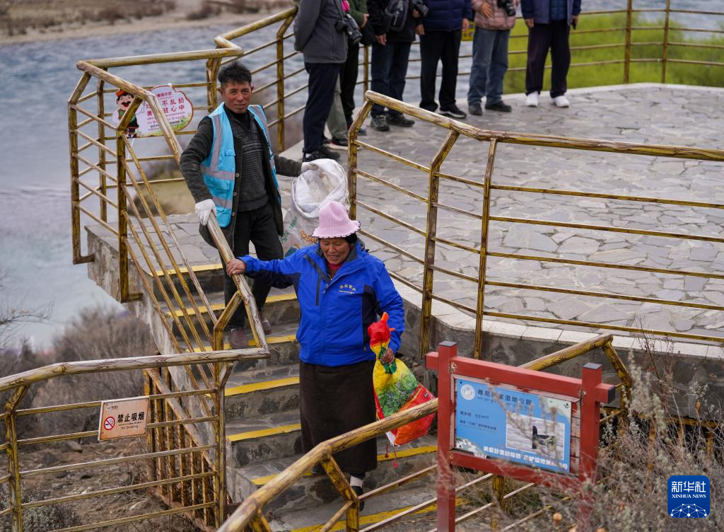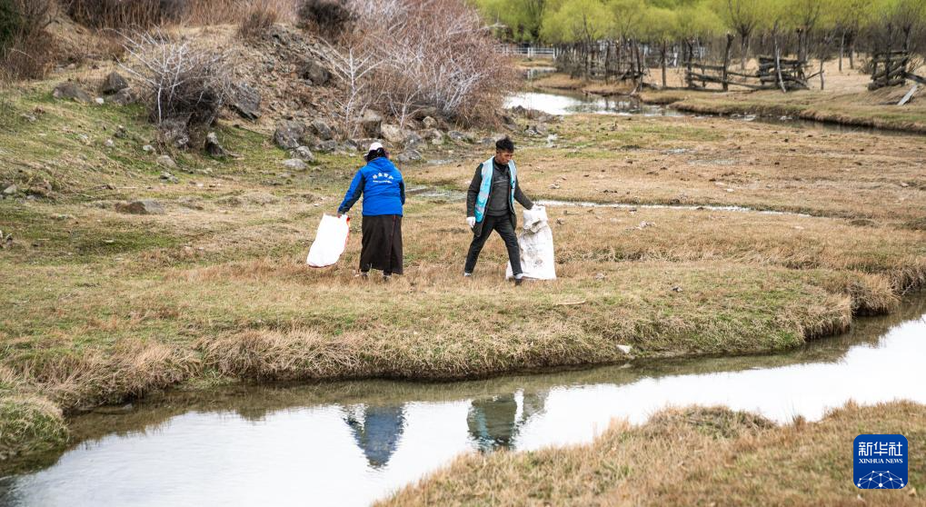 4月4日,雅尼国家湿地公园管护员在巡护途中清理垃圾。