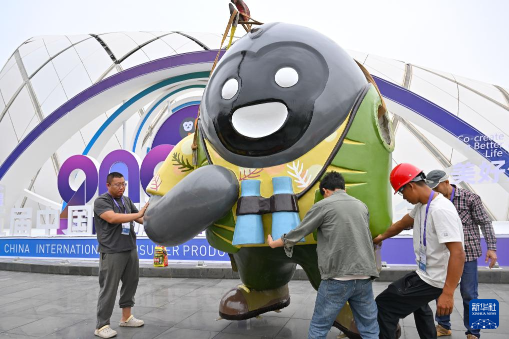 4月10日,工作人员在摆放消博会吉祥物。