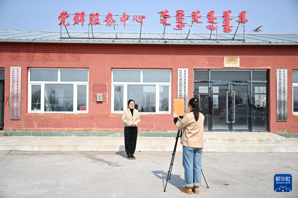 4月11日,在内蒙古兴安盟科右中旗巴彦呼舒镇浩特化嘎查党群服务中心,乡镇干部在为“村闻联播”拍摄素材。