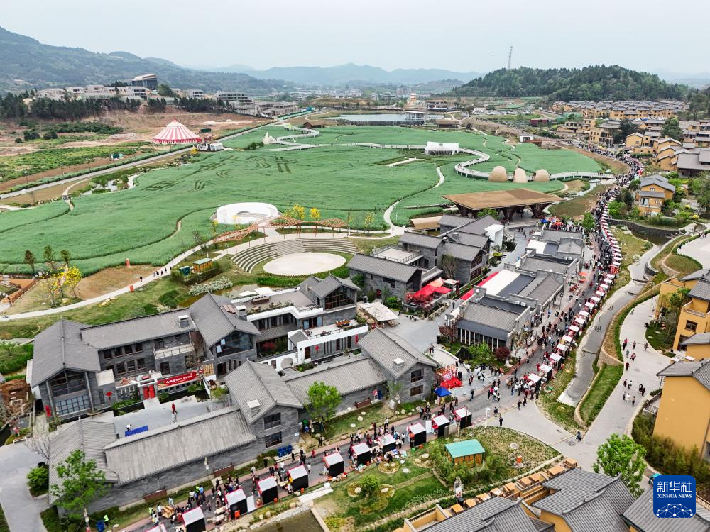 4月11日,在四川省中江县觉慧村非遗大集现场,游客在欣赏非遗代表性项目展演(无人机照片)。