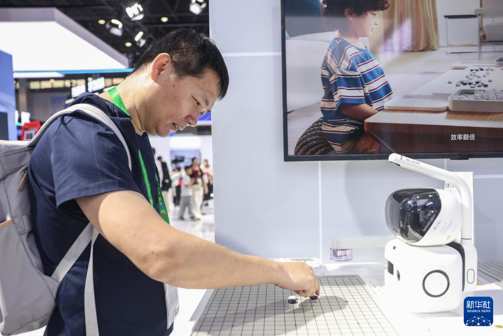 4月13日,观众在第五届消博会上体验商汤科技的AI围棋机器人。