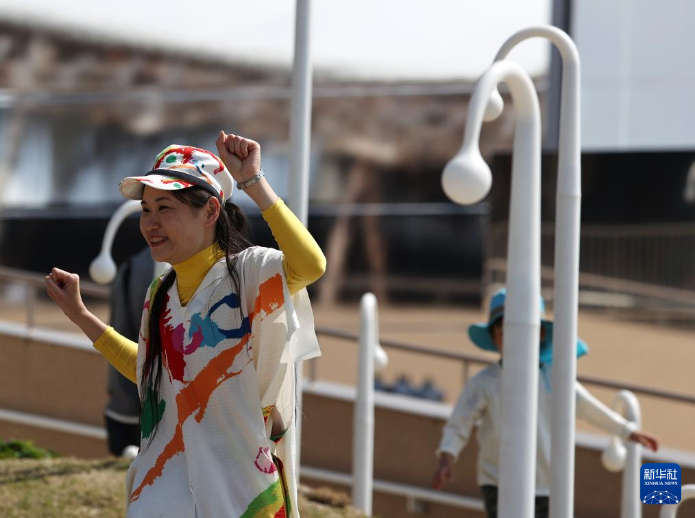 4月14日,游客在日本大阪的世博会园区内游览。