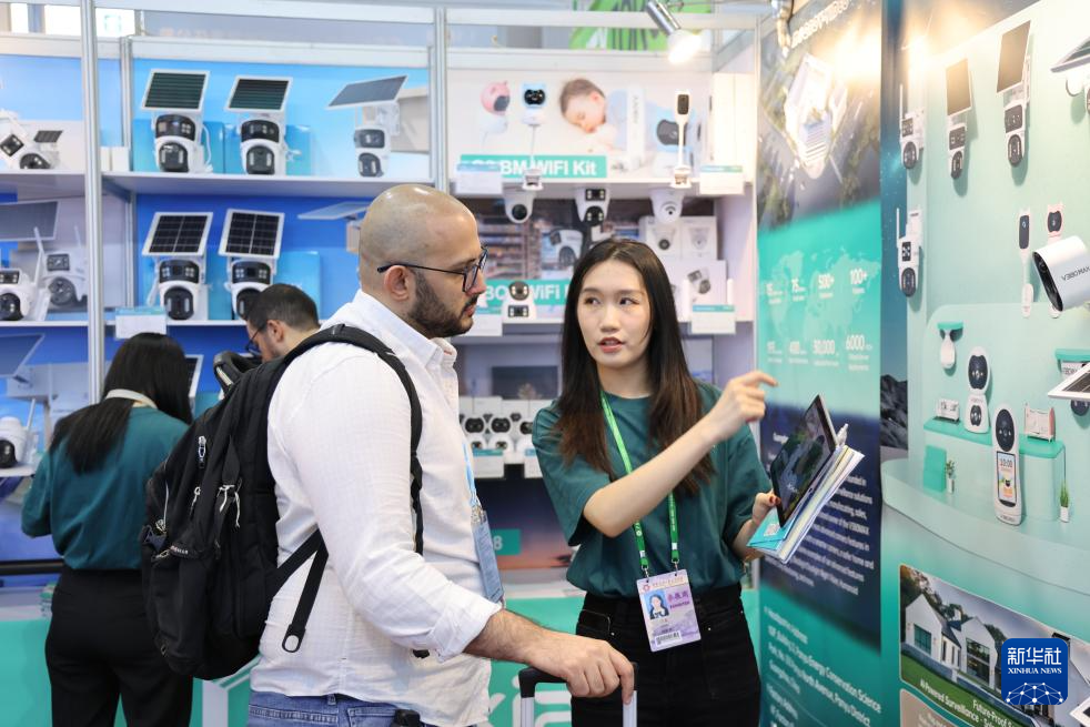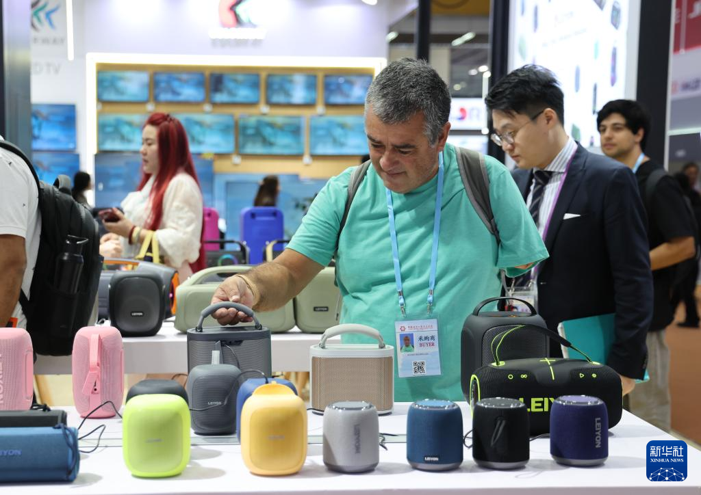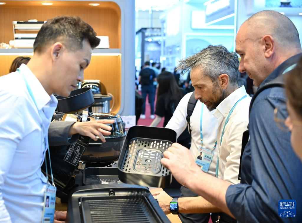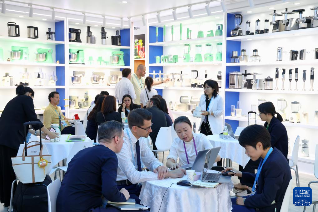 4月15日,一名境外采购商(中)在一家电器公司的展区洽谈选购。