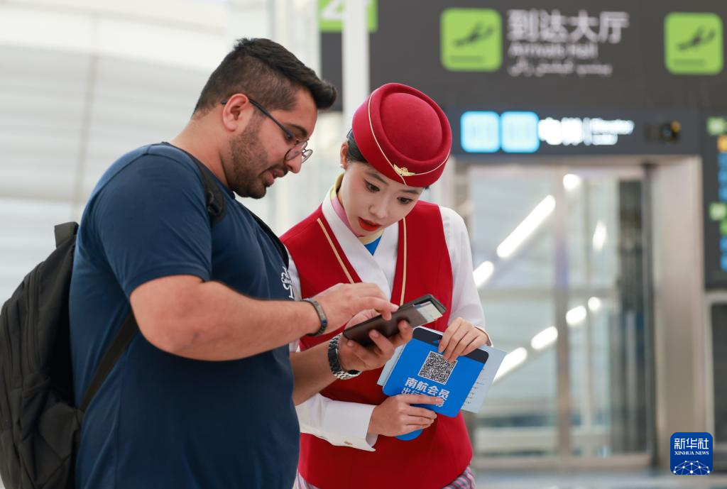 4月17日,南航工作人员在乌鲁木齐天山国际机场北区航站楼出发大厅引导旅客办理登机手续。