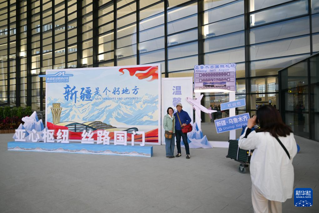 4月17日,旅客在乌鲁木齐天山国际机场北区航站楼外合影留念。