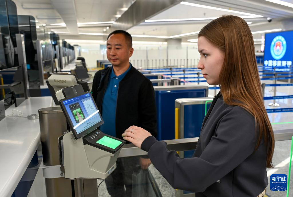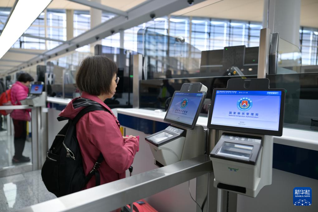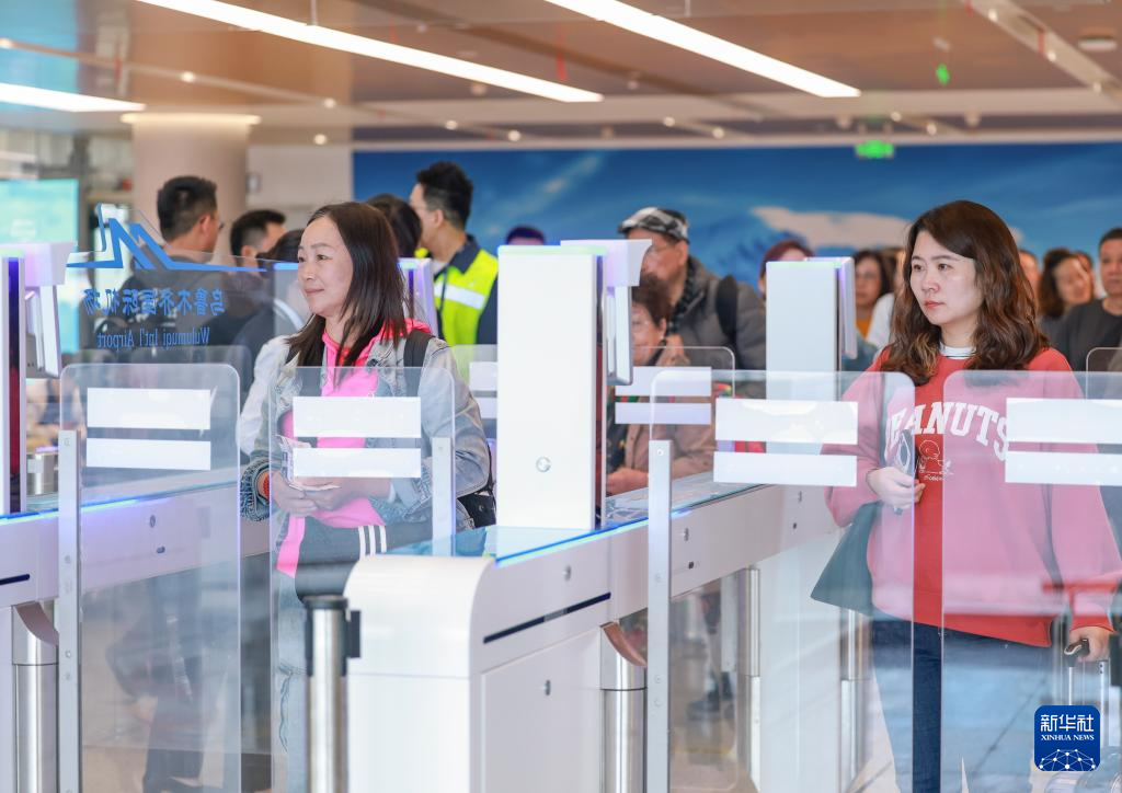 4月17日,旅客在乌鲁木齐天山国际机场北区航站楼出入境边防检查出境大厅办理手续。