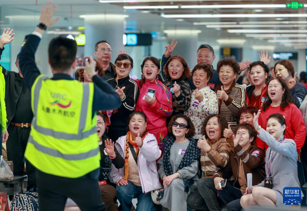 4月17日,旅客在乌鲁木齐天山国际机场北区航站楼候机厅与乌鲁木齐航空公司工作人员合影留念。